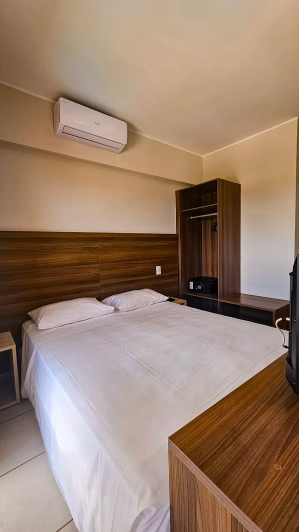 Apartamento feito de alvenaria, próximo à piscina e a recepção, com cofre privativo, ar-condicionado, cama box, frigobar, cozinha americana e TV de LCD.